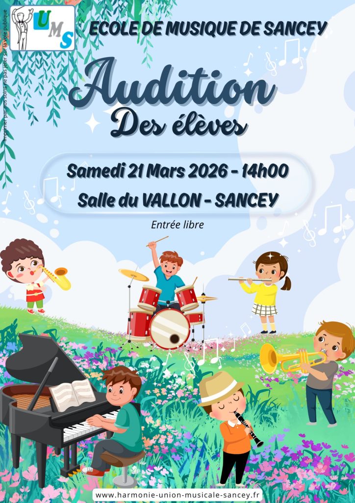 - Samedi 21 Mars 2026 à 14h : Audition des Elèves de l’Ecole de Musique (Salle du Vallon)